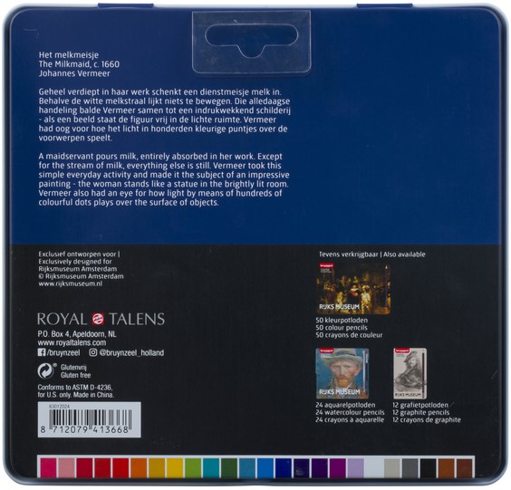 Het Melkmeisje van Johannes Vermeer, een hoogtepunt van een bezoek aan het Rijksmuseum, siert de buitenkant van dit blik met mooie kleurpotloden