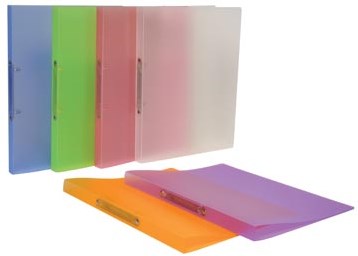 Voor A4 formaat. Uit PP. Rug van 2 cm. Met 2 ringen. Geassorteerde semi-transparante kleuren.