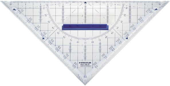 Met de geodriehoek van Staedtler kun je lijnen trekken en opmeten, hoeken meten en graden berekenen. Ook kun je hem gebruiken als parallelliniaal. De tekendriehoek heeft een blauwe handgreep.