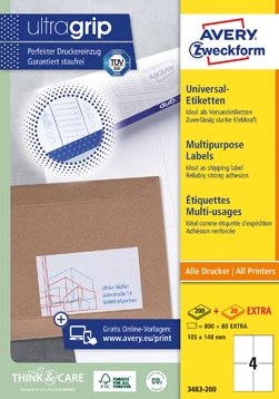 Avery etiketten Zweckform 3483 105x148mm A6 wit 800stuks