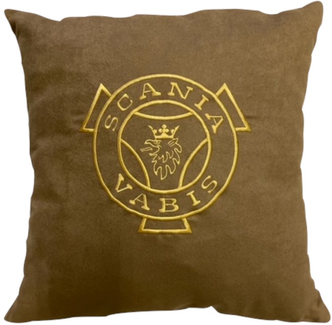 Taupe colored cushion with gold stitched Scania Vabis logo